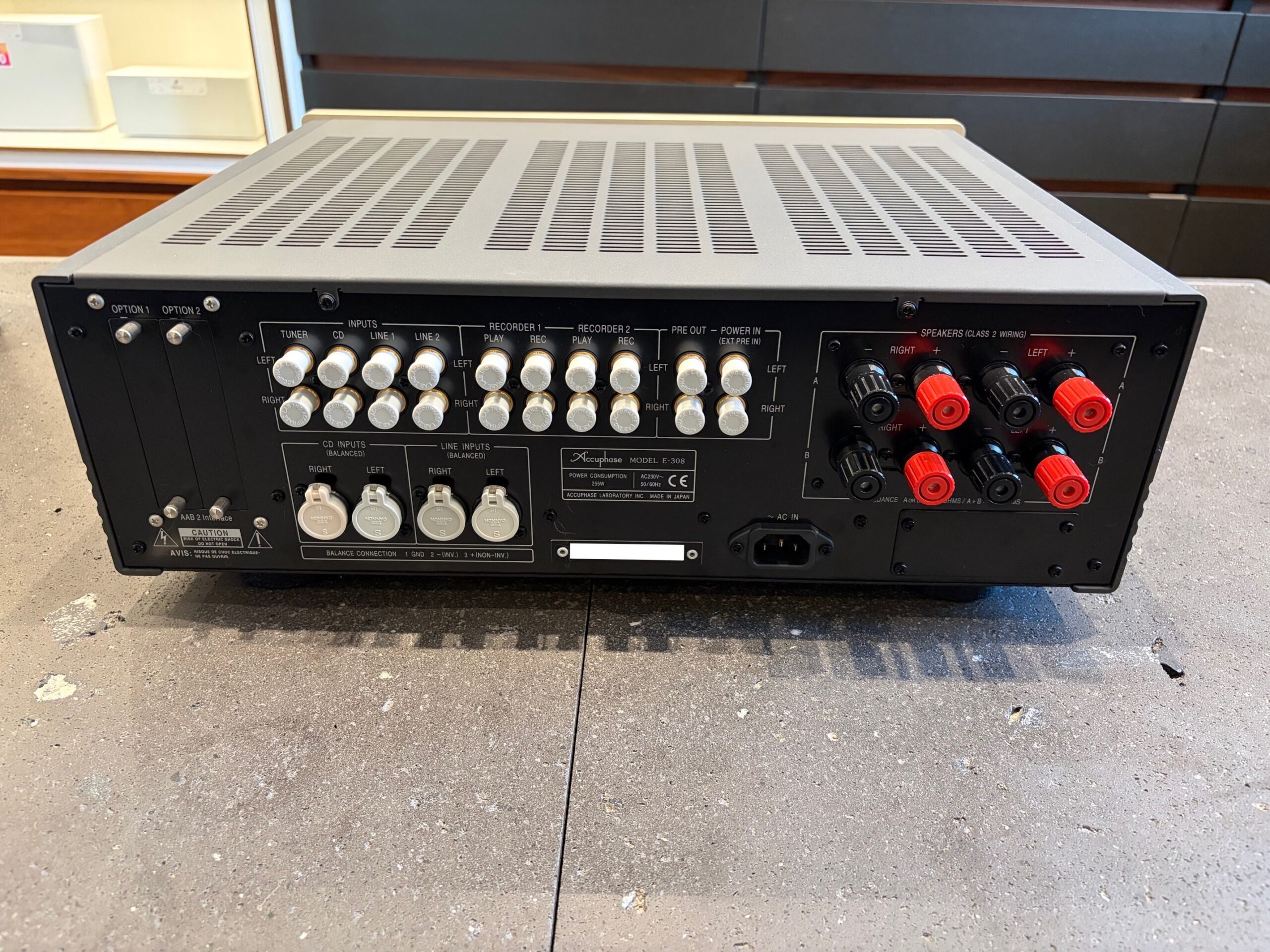 Ein integrierter Vollverstärker bietet verschiedene Vorteile wie einfache Bedienung und geringen Platzbedarf. Da jedoch der Gesamtverstärkungsfaktor sehr hoch ist, kann sich schon die geringste Störung oder Übersprechen im Eingang negativ auf das Klangresultat auswirken. Diese Gefahr ist beim E-308 auf wirkungsvolle Weise gebannt, da Vorverstärker und Endstufe sowohl elektrisch als auch strukturell völlig getrennt voneinander arbeiten. Ein Trenn schalter ermöglicht sogar die völlig unabhängige Verwendung von Vorverstärker und Endstufe.