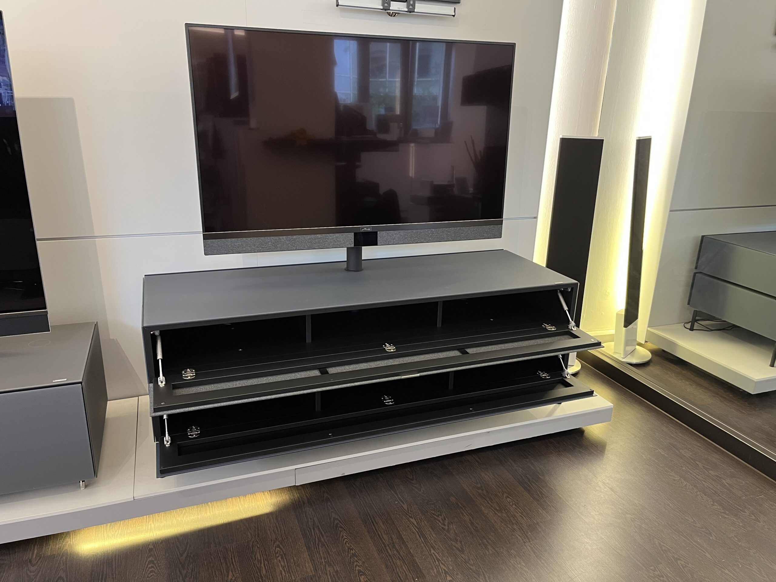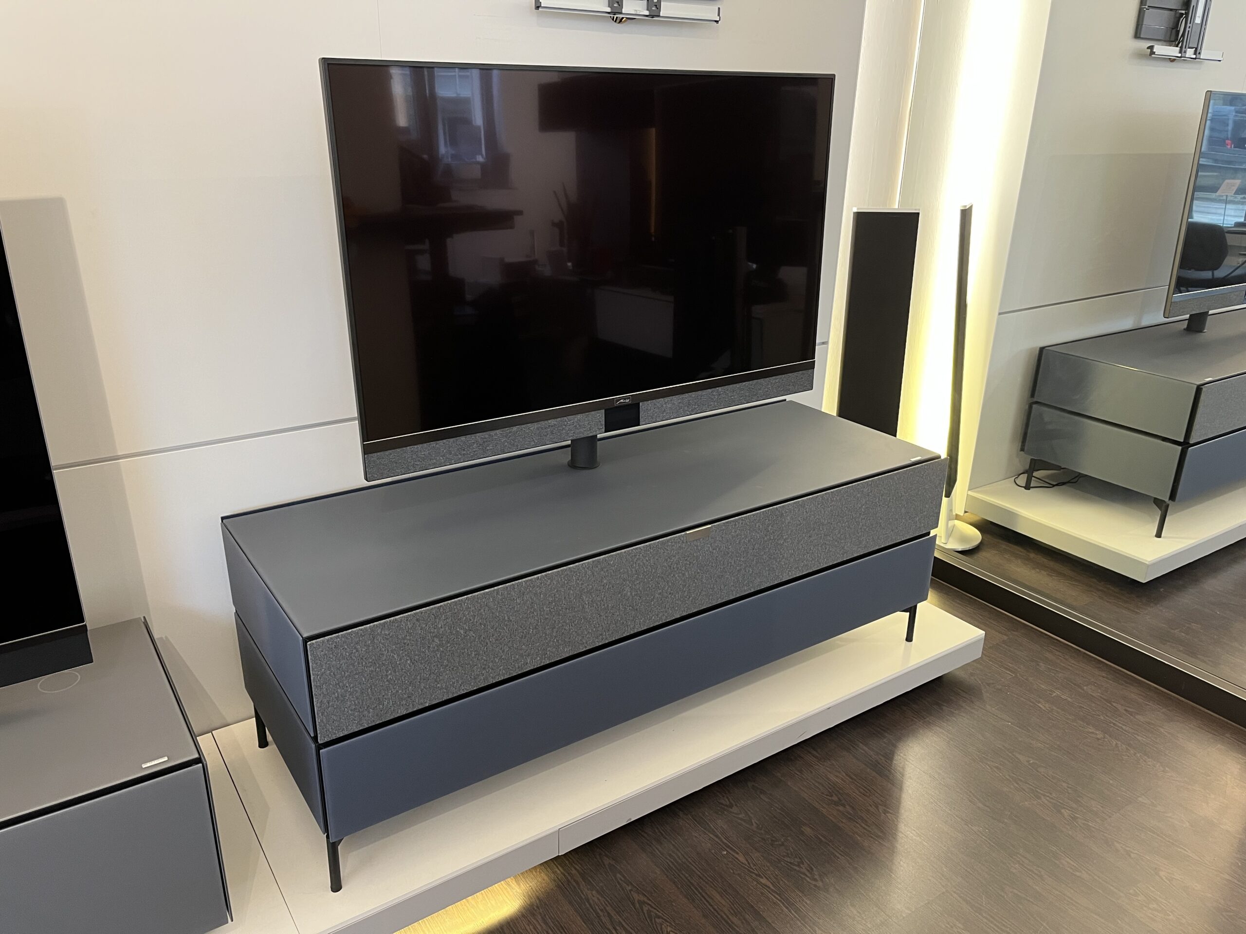 in Night Blue mit 2 Klappen (eine mit Stofffront für eine Soundbar oder Lautsprecherlösung), Edge Füße und drehbarer TV Halterung